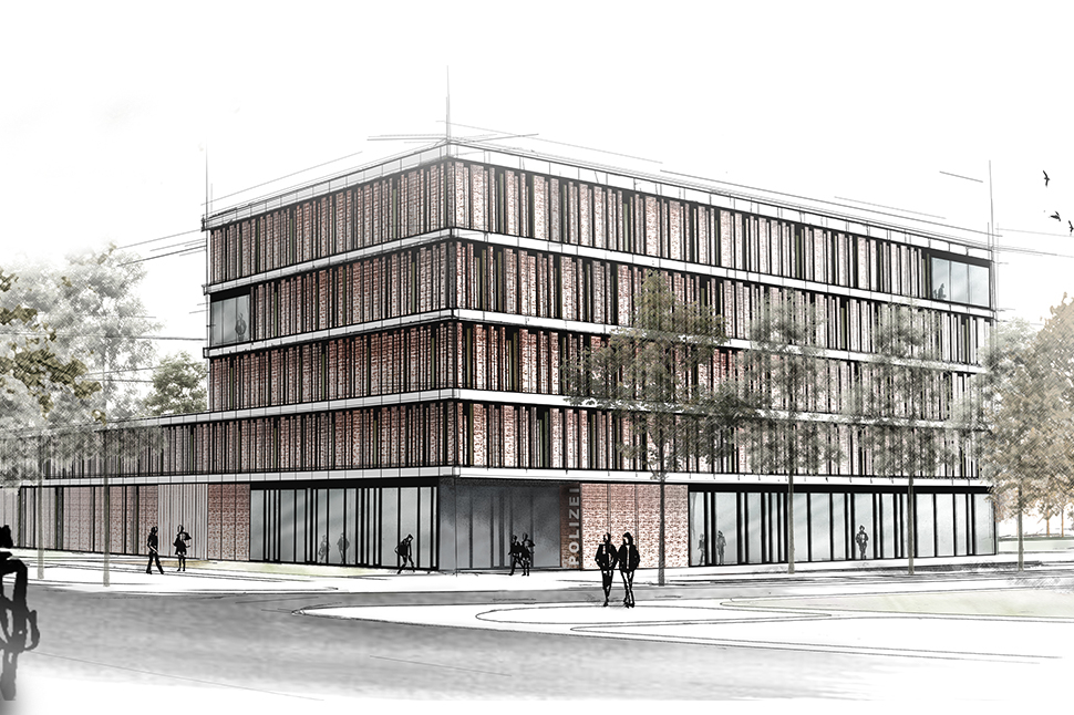Neubau der Polizeiinspektion Augsburg West inkl. Kriminalpolizei für zentrale Aufgaben, Kriminalpolizei Augsburg, Verkehrsinspektion, operative Ergänzungsdienste, Polizeihof und Tiefgarage.