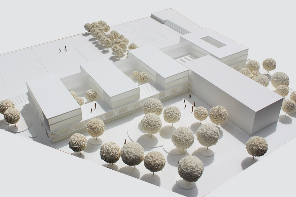 Das Baufeld wird besetzt durch eine viergeschossige Kammstruktur aus zweigeschossigen Ost- West orientierten Baukörpern auf zweigeschossigem Sockel, die im Wechselspiel mit dem zu erhaltenden Bestand einen neuen Ankerpunkt im Quartier schafft. Es entsteht ein Ensemble aus 4 Sporthalleneinheiten, Lernhäusern, Fachklassen, Aula, Mensa Ganztags-und Verwaltungsbereich.