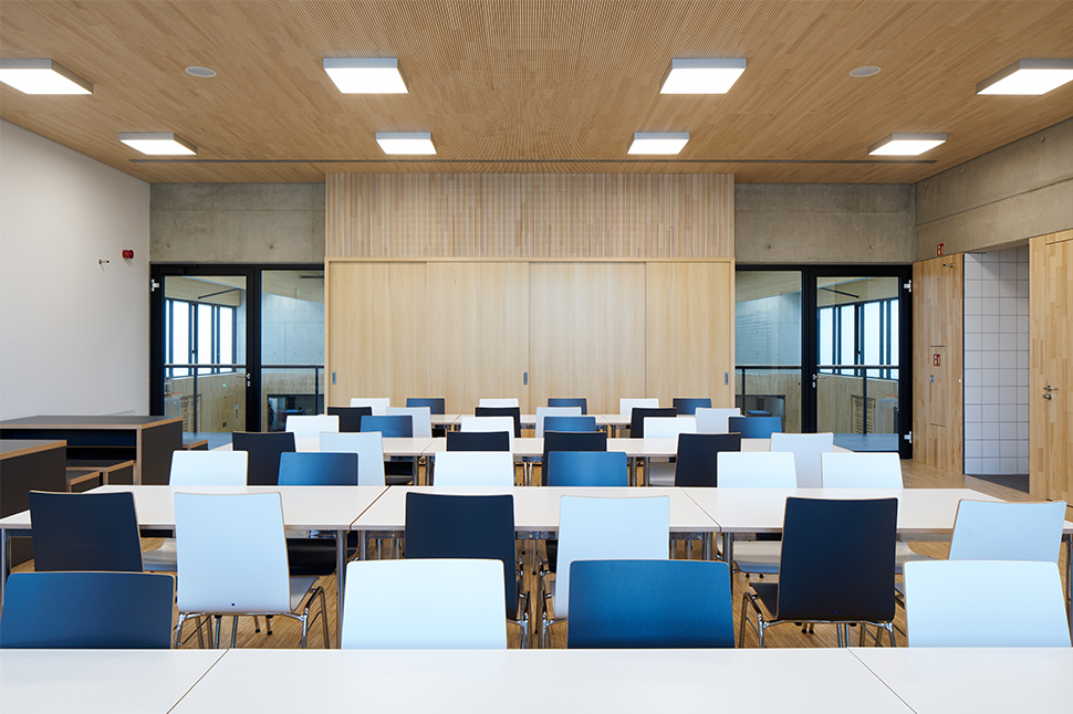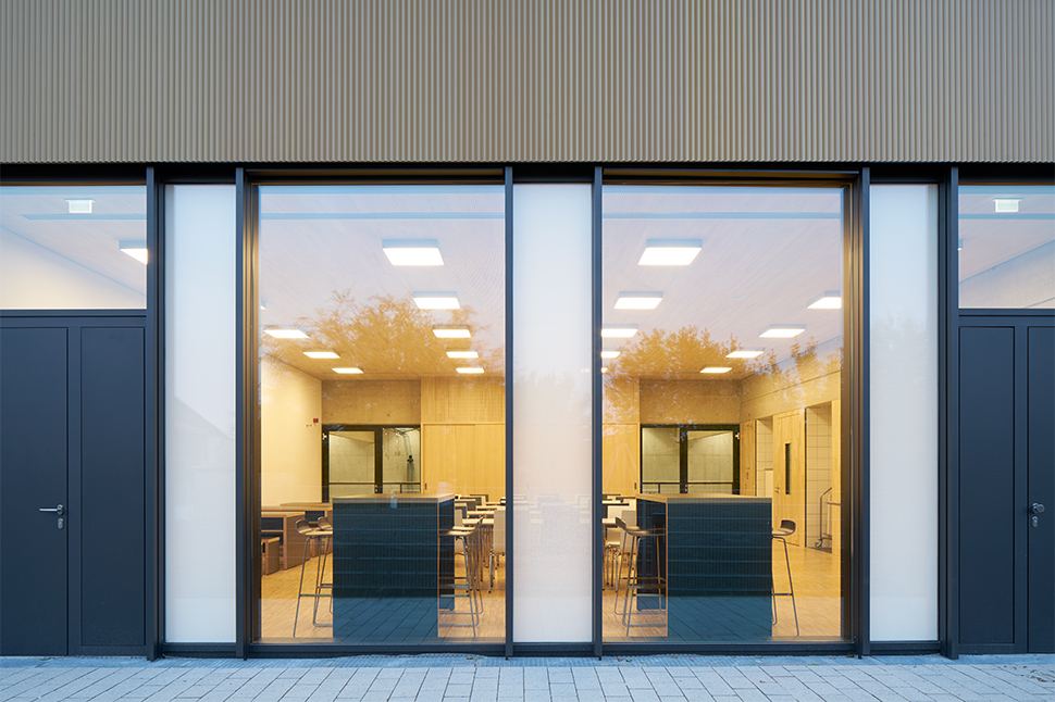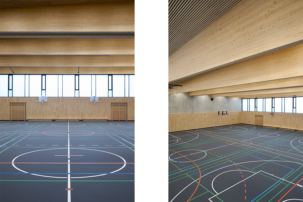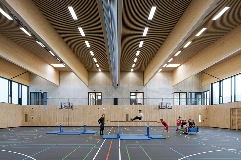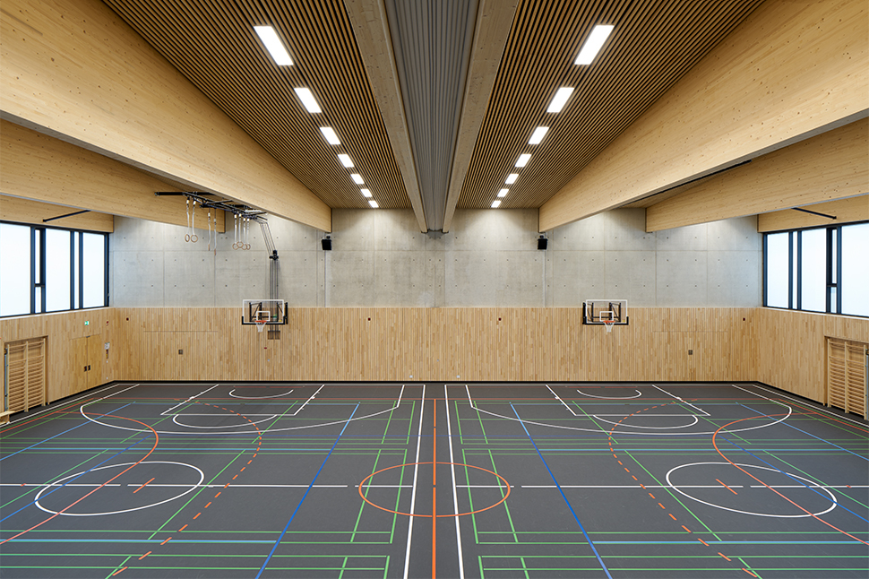 Neubau einer Zweifachsporthalle inklusive Ganztagesbereich mit einem Dachtragwerk aus Holzbindern.