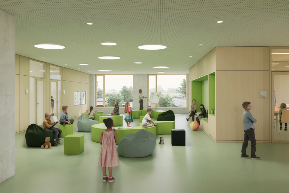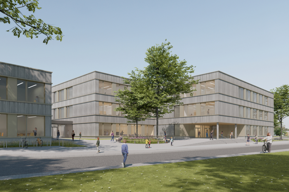 Das Projekt wird in zwei Bauabschnitten realisiert – zunächst entsteht die neue Mittagsbetreuung, anschließend folgt die Grundschule.