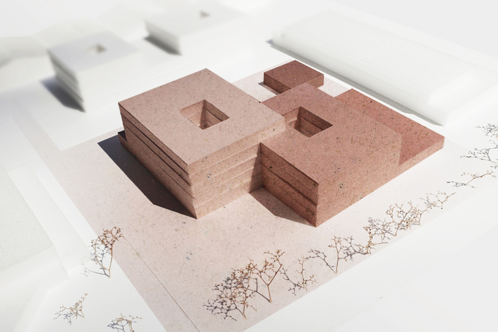Die Gebäudestruktur zielt darauf ab mit einer flächigen Sockelbebauung „Innenqualität“ der Außenräume zu generieren. Zwei gegeneinander versetzte Hauptbaukörper bilden maßstäbliche Bezüge und definieren Freiräume. Mit einer Fassung der Außenräume durch Überdachungen entstehen filterartige Bezüge zur Straße und Wirtschaftsschule. Diese Bereiche stehen für Fahrradstellplätze und Pausen zur Verfügung. Ebenso werden in der Ebene +1 Freiflächen generiert, die attraktive Nutzungen ermöglichen. Die Nutzung Jugendtreff ergänzt die Erdgeschosszone. An der Asamstraße entsteht eine Bus- und PKW Vorfahrt. Der Sockelkranz schafft