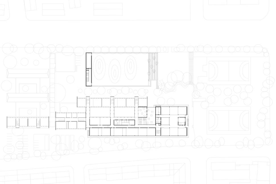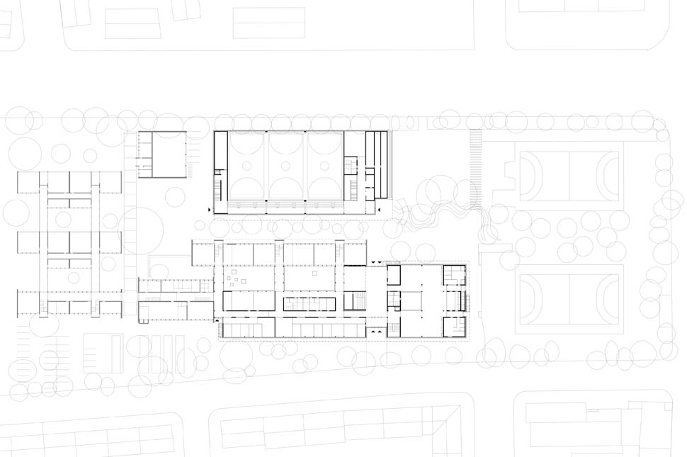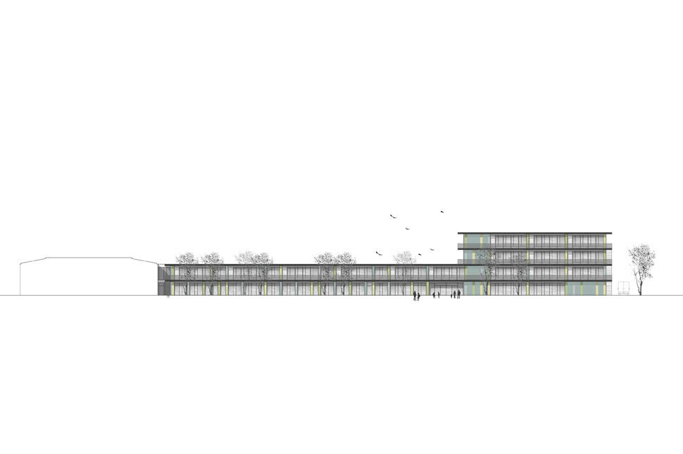 Die eigentliche Schulerweiterung erfolgt an der Schrobenhausener Straße mit einem zweigeschossigen Baukörper mit Verwaltung im Erdgeschoss und Fachklassen im 1. OG sowie einem viergeschossigen Baukörper mit Speisesaal und Küche im EG, Ganztagesbereich im 1.OG und Lernhäuser im 2. Und 3. OG. Die Fuge zwischen den Gebäudeteilen bildet den neuen Haupteingang der Schule mit neuer Adressbildung. Der Speisesaal im Erdgeschoss wird für 300 Sitzplätze konzipiert. Die neue Sporthalle wird östlich im Bereich des derzeitigen Pausenhofs angeordnet und um eineinhalb Geschosse unter Berücksichtigung der Grundwassersituation abgesenkt. Das Dach der Sporthalle wird als Pausenfläche angeboten. Die Belichtung der Sporthalle wird durch Oberlichter gewährleistet. Die Dreifachsporthalle soll als Versammlungsstätte mit einer maximalen Personenzahl von 400 Personen umgesetzt werden.