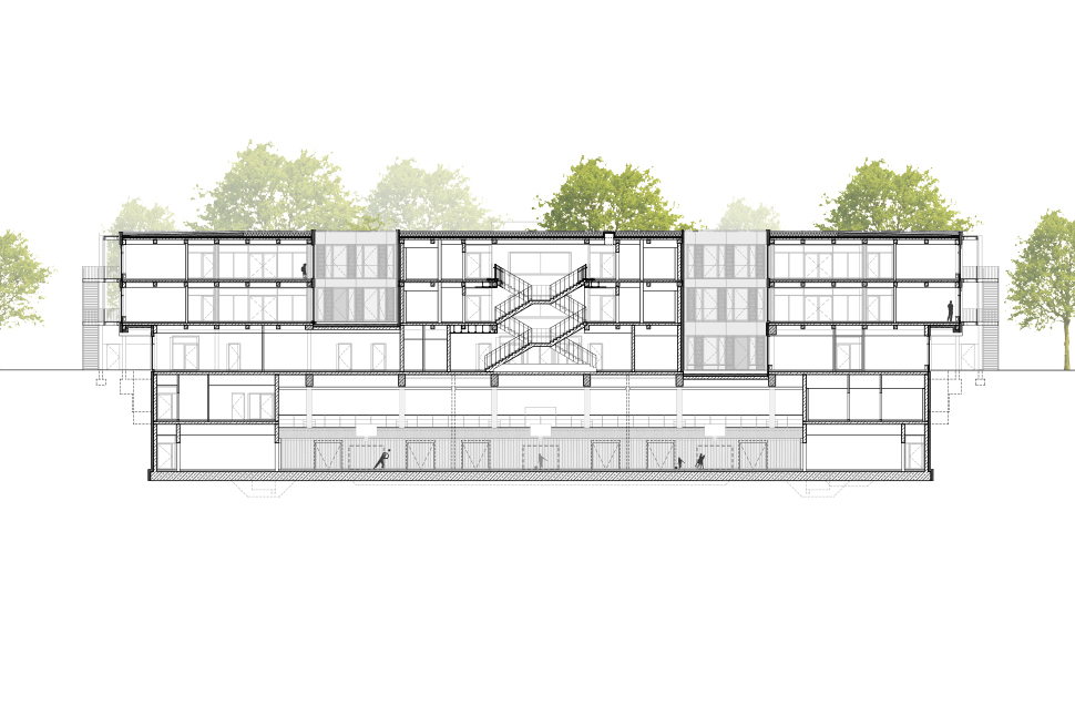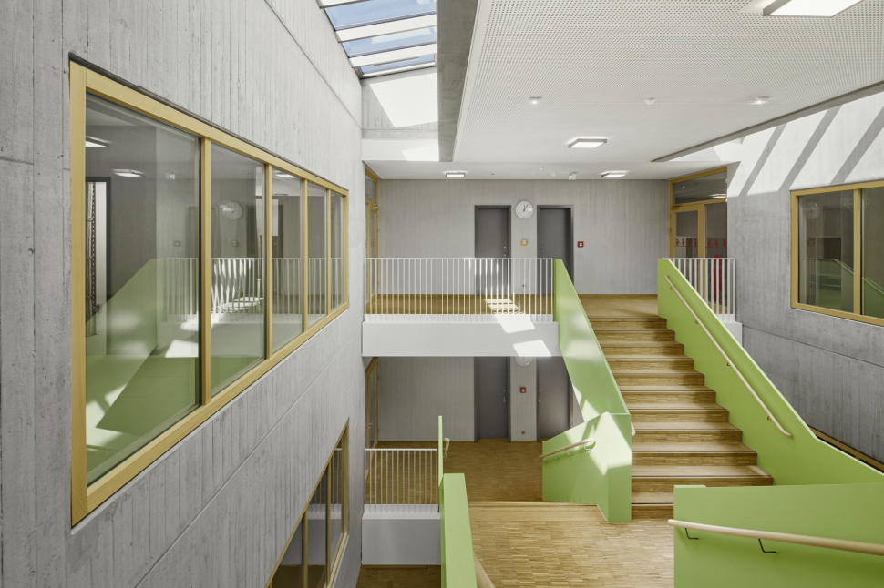 Grundidee ist die Errichtung eines sehr kompakten Baukörpers für Sporthalle und Schulgebäude auf dem derzeitigen Sportplatz im Zusammenspiel mit einem Solitärbau für das Haus für Kinder. Die Dreifachsporthalle wird unterirdisch angeordnet und von dem Schulgebäude in Längsrichtung überspannt. Die natürliche Belichtung der Halle wird über einen Lichthof mit Abböschung gewährleistet. Diese Stapelung der Nutzungen generiert im Endausbau großzügige Freiflächen und ermöglicht es zudem den Schulbetrieb während der Bauzeit aufrecht zu erhalten.