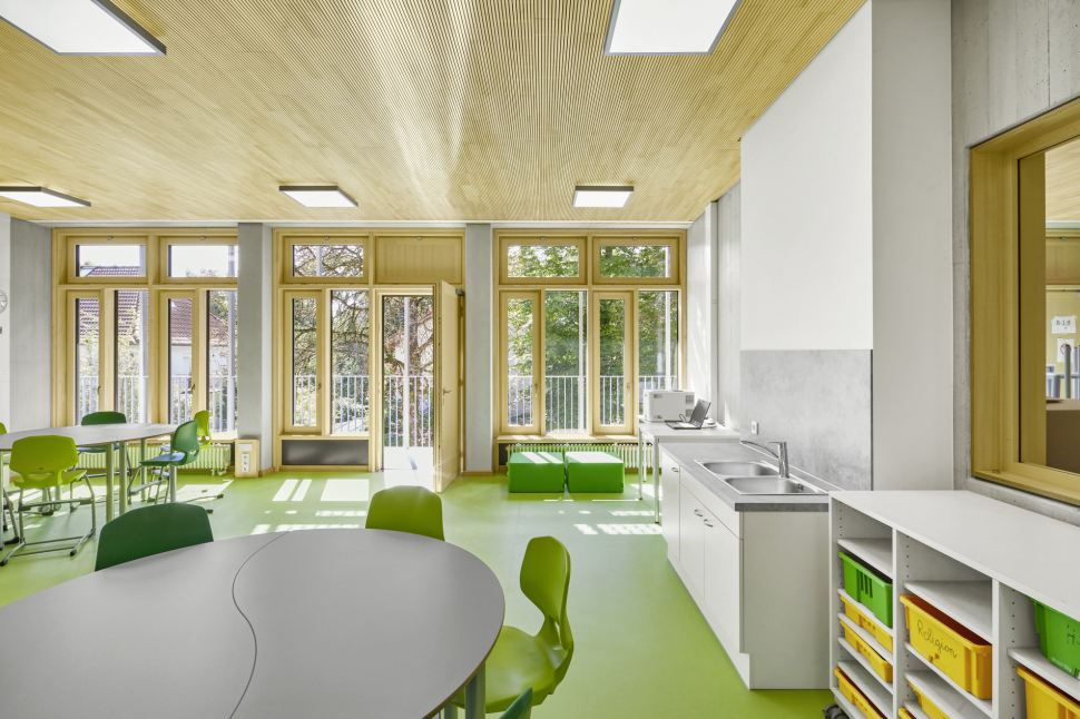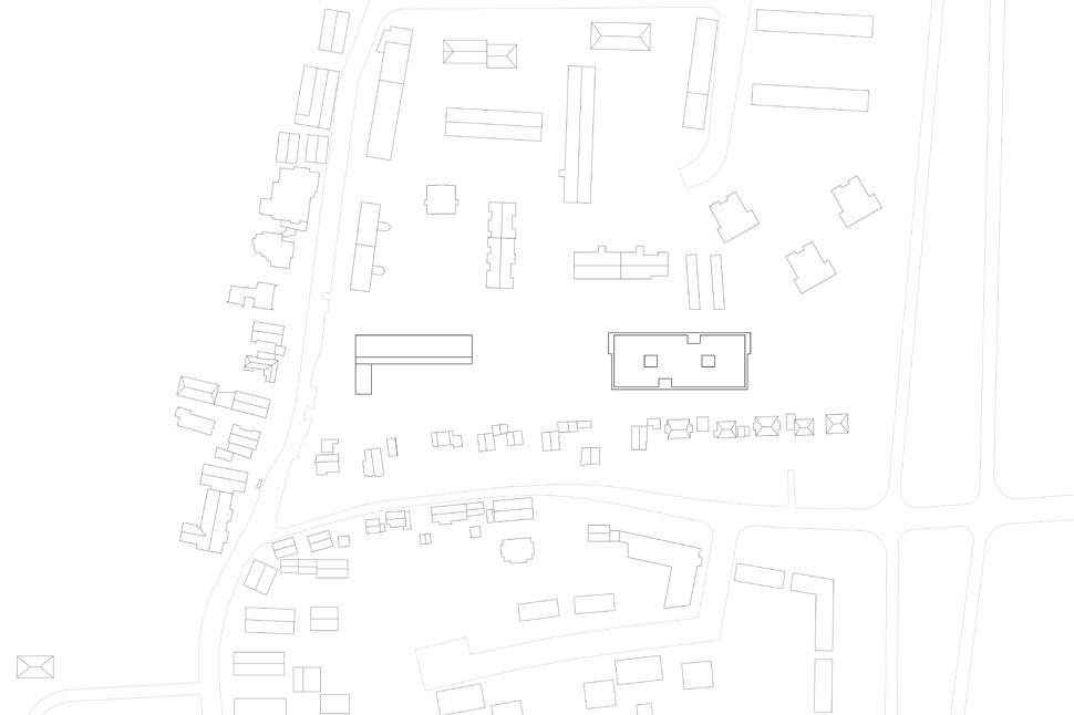 Es entsteht eine logische Folge von Freiflächen und Gebäuden, die sich von der Oberföhringer Straße nach Osten hin entwickeln. Eine Piazzetta am Haus für Kinder bildet die Adresse der Liegenschaft. Der Pausenhof zwischen Schule und Haus für Kinder schafft Synergien und dient als Eingangsbereich der Schule. Das Schulgebäude mit seinem durchlässigen Erdgeschoss verbindet den Pausenhof und die Sportfreiflächen. Die Gebäude und Freiräume sind entlang eines nördlichen Erschließungswegs, der dem Grundstückszuschnitt entspricht, „aufgefädelt“ und machen die Abfolge erlebbar