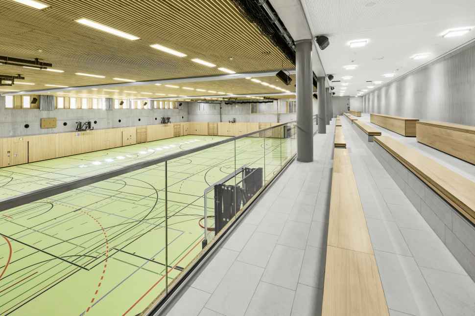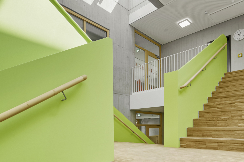 Grundidee ist die Errichtung eines sehr kompakten Baukörpers für Sporthalle und Schulgebäude auf dem derzeitigen Sportplatz im Zusammenspiel mit einem Solitärbau für das Haus für Kinder. Die Dreifachsporthalle wird unterirdisch angeordnet und von dem Schulgebäude in Längsrichtung überspannt. Die natürliche Belichtung der Halle wird über einen Lichthof mit Abböschung gewährleistet. Diese Stapelung der Nutzungen generiert im Endausbau großzügige Freiflächen und ermöglicht es zudem den Schulbetrieb während der Bauzeit aufrecht zu erhalten.