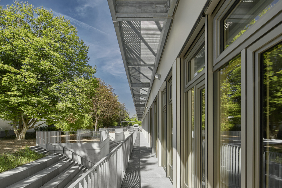 Es entsteht eine logische Folge von Freiflächen und Gebäuden, die sich von der Oberföhringer Straße nach Osten hin entwickeln. Eine Piazzetta am Haus für Kinder bildet die Adresse der Liegenschaft. Der Pausenhof zwischen Schule und Haus für Kinder schafft Synergien und dient als Eingangsbereich der Schule. Das Schulgebäude mit seinem durchlässigen Erdgeschoss verbindet den Pausenhof und die Sportfreiflächen. Die Gebäude und Freiräume sind entlang eines nördlichen Erschließungswegs, der dem Grundstückszuschnitt entspricht, „aufgefädelt“ und machen die Abfolge erlebbar