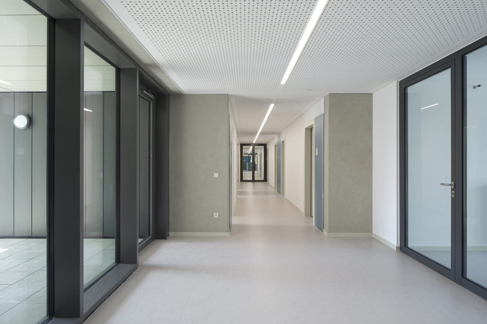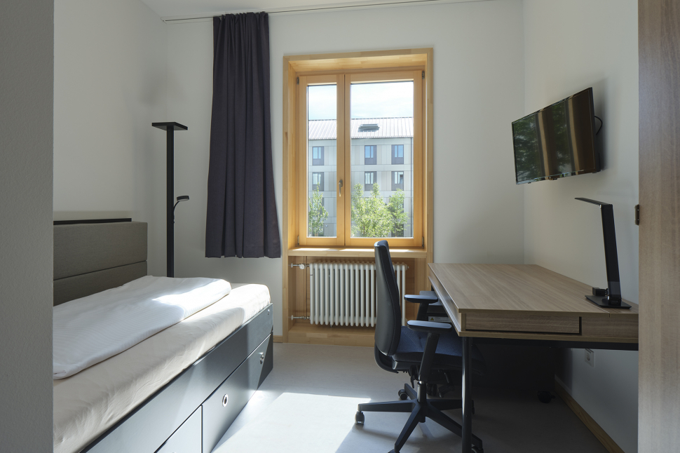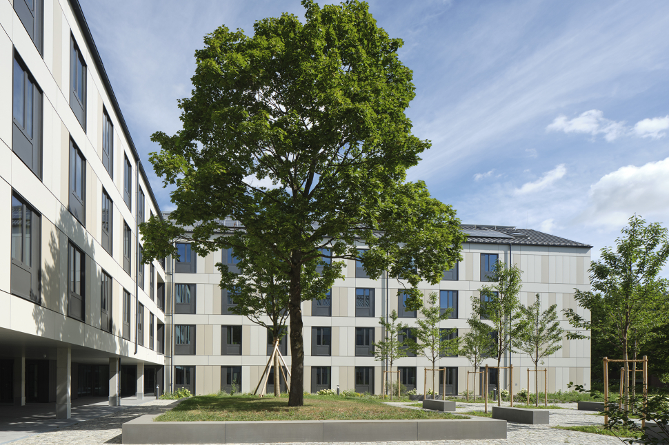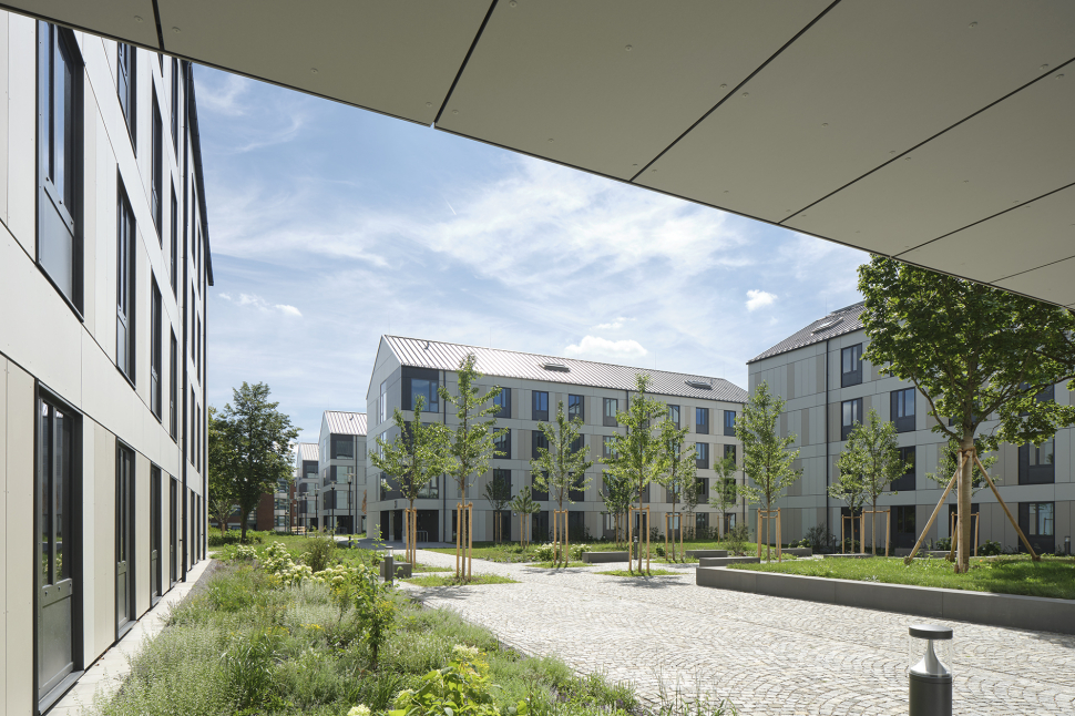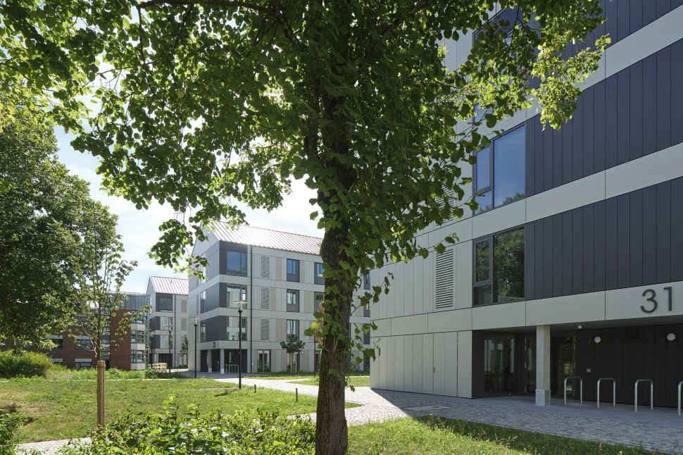 Entstanden sind viergeschossige Baukörper mit Satteldächern, die zusammen ein harmonisches Ensemble bilden. Nördlich der Riegelgebäude verläuft ein interner „Quartiersweg“ von Ost nach West und durch die offene Erdgeschosszone des U-Gebäudes. Dadurch wird eine direkte Verbindung vom neuen Wohnquartier zur westlich gelegenen Mensa geschaffen.