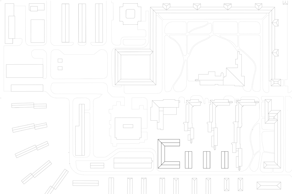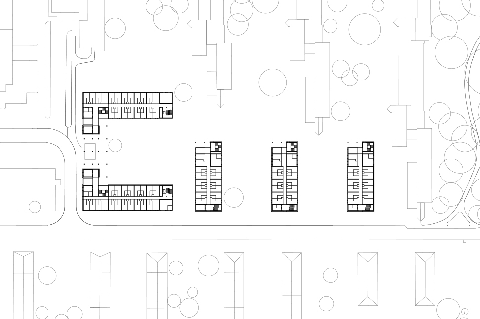 Im Rahmen einer Machbarkeitsstudie wurde der städtebauliche Rahmen für die Erstellung von 400 Wohneinheiten festgelegt. Im Westen des Grundstücks liegt ein U-förmiges Gebäude, während sich Richtung Osten eine Abfolge von drei kürzeren, Ost-West-orientierten Riegelgebäuden entwickelt. Das U-Gebäude bildet nach Westen eine klare Gebäudekante und öffnet sich nach Osten hin zu den Riegelgebäuden.