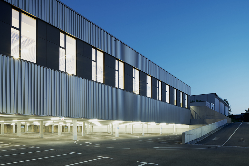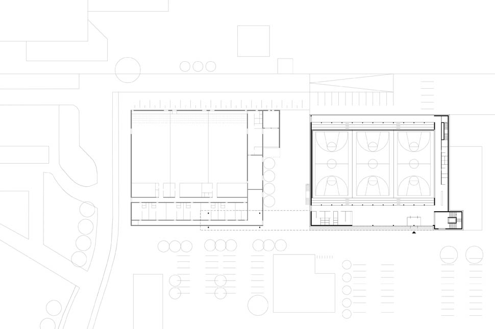 Umkleidebereiche werden auf Spielfeldebene angeordnet, sinnfällig ebenso die Geräteräume. Auf der Ebene unter Sporthalle wird eine natürlich belüftete, offene unterirdische Parkebene erstellt mit 100 Stellplätzen. Die Zufahrt erfolgt über eine offene Rampe, die natürliche Belüftung erfolgt über einen großzügigen Lichtschacht.