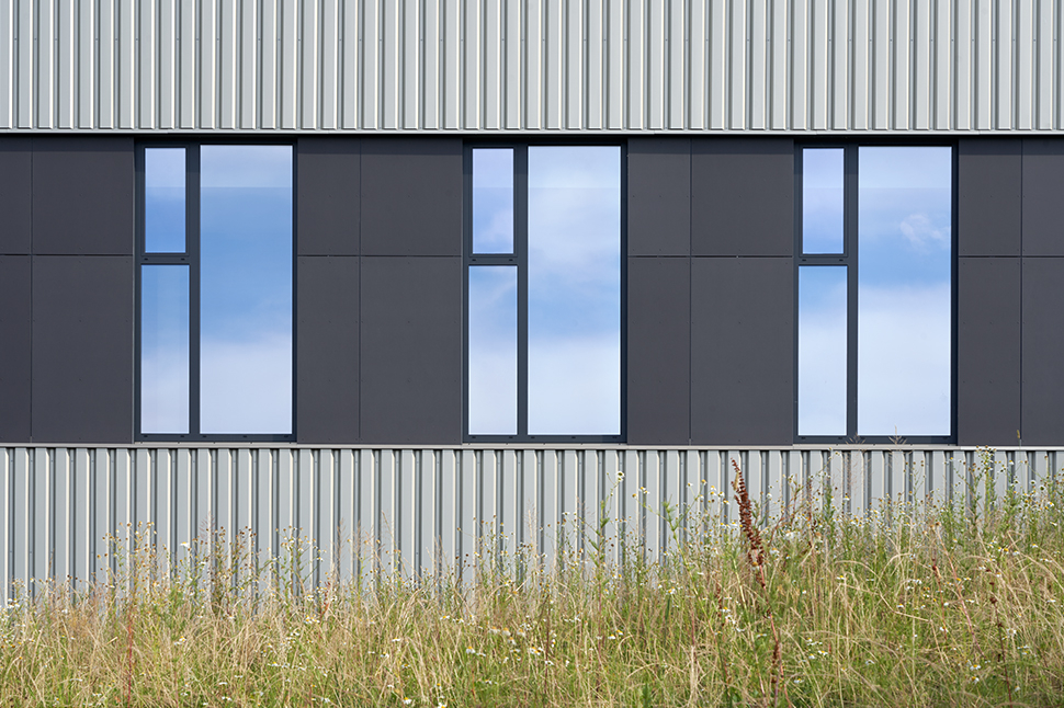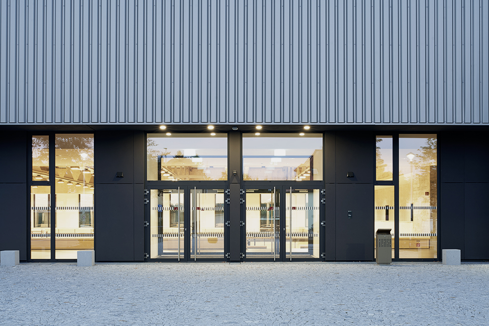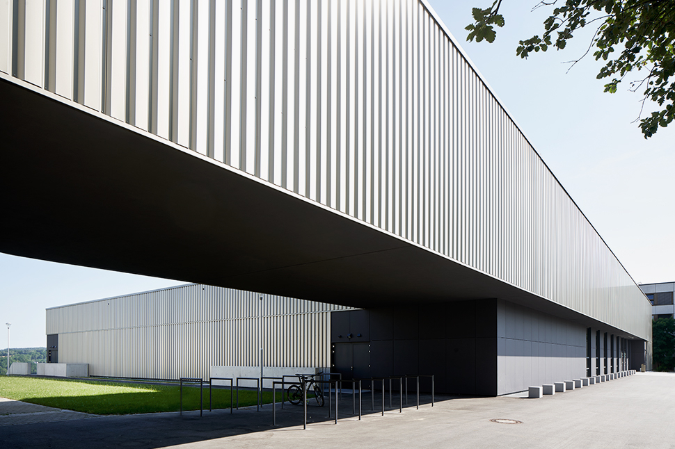 Die lineare Struktur des Laufbahnköpers verknüpft die zwei Sporthallen im 1.OG und schafft zum Vorplatz eine entsprechende Prägnanz.
