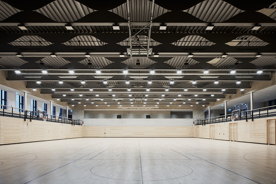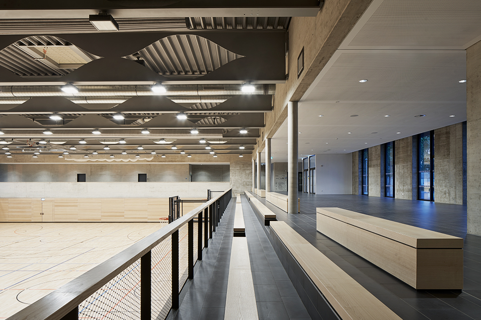 Die Sporthalle wird als Versammlungsstätte für bis zu 600 Zuschauer ausgebildet. Die Zuschauerbereiche sind an den beiden Längsseiten der Halle angeordnet. Im kleinen Maßstab kann so „Arena“ - Atmosphäre geschaffen werden. Die direkte Anordnung des Foyers an den südlichen Zuschauerbereich ermöglicht eine sinnvolle Bespielung. Dem Foyer ist eine kleine Ausgabe mit Küche angegliedert.
