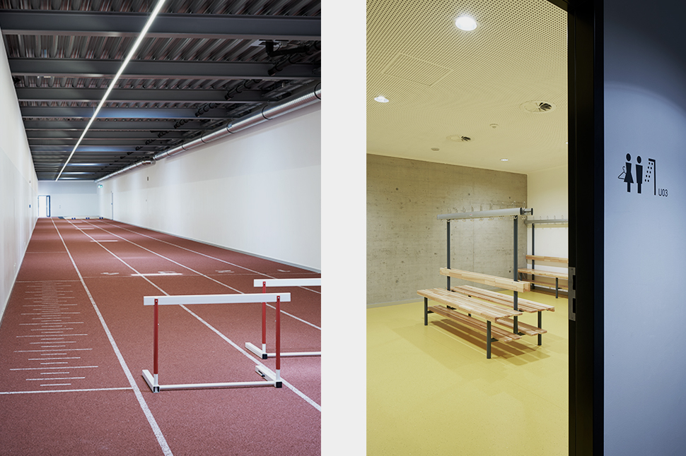 Eine ergänzende Nutzung stellt die Lauf- und Weitsprunganlage dar, die als eigenes Bauteil im 1.OG eine Verbindung zur bestehenden Sporthalle darstellt.