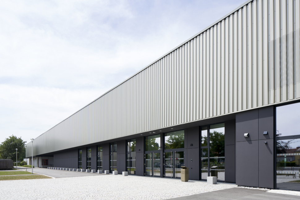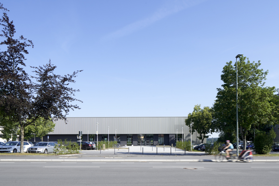 Die lineare Struktur des Laufbahnköpers verknüpft die zwei Sporthallen im 1.OG und schafft zum Vorplatz eine entsprechende Prägnanz.