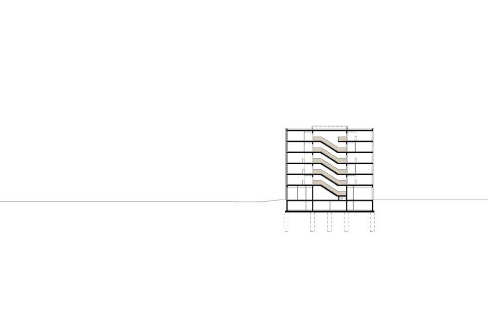 In einem kompakten, quadratischen Gebäudekörper mit 25 m Seitenlänge wird die Kammerhauptverwaltung organisiert. Die Haupterschließung erfolgt über das großzügige Foyer und leitet Angestellte und Besucher über ein attraktives zentrales Treppenhaus mit Aufzugskern und Luftraum in die Obergeschosse. An diesem Luftraum werden Wartezonen und Teeküchen angeboten. Durch Ausblicke und Lichtführung über Verglasungselemente wird die Orientierung im Gebäude Angrenzend an das Foyer werden im EG die Poststelle, Infotheke und Besprechungsräume angeordnet. Im westlichen Bereich befinden sich zudem EDV-Räume und eine Bewirtungsküche. Im 1. - 5. Obergeschoss wird eine reine Büronutzung abgebildet.