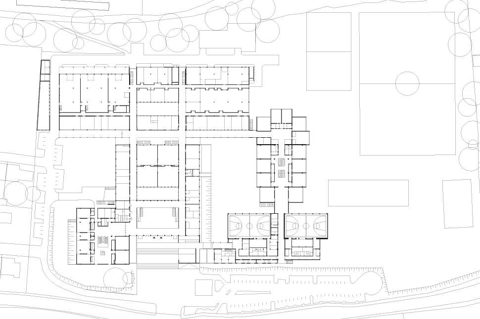 Die leistungsfähige Haupterschließung durch zwei Nord- Süd „Straßen“ bleibt erhalten. Die drei Werkstatt- und Laborbereiche Bautechnik, Elektrotechnik und Mechatronik werden analog durch ein bzw. zwei Querspangen verknüpft. Die Verbindung zu Trakt 5 (HTL) als gedeckter Kolonnadengang kann ebenso als witterungsgeschützte Pausenfläche genutzt werden. In Trakt 1 wird das Untergeschoss für eine attraktive Nutzung aktiviert. Hierfür wird an der Ostseite ein Lichtgraben ebenengleich mit der Haupteingangsebene angeordnet.