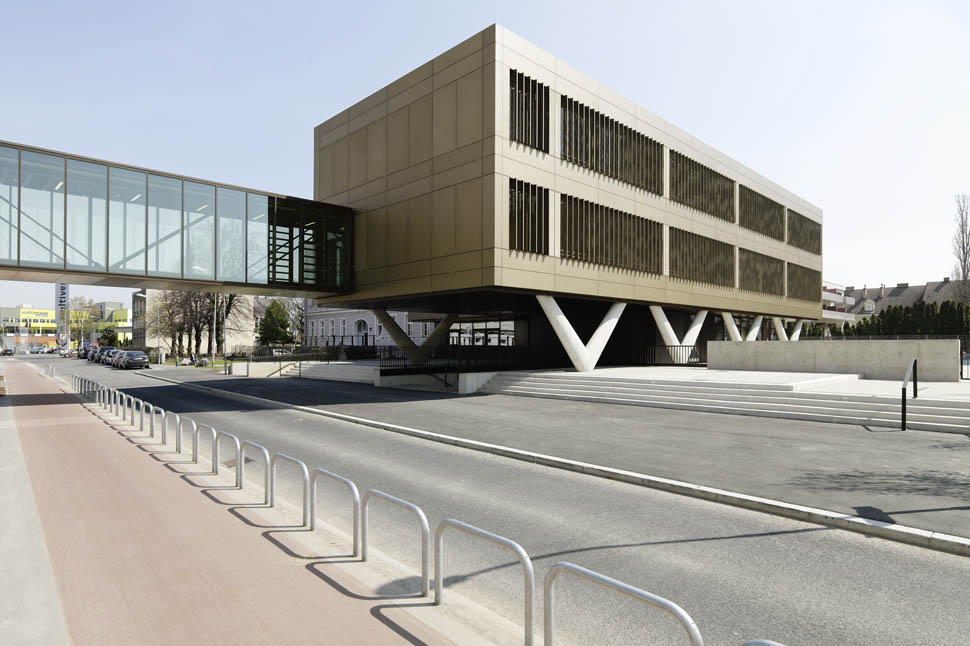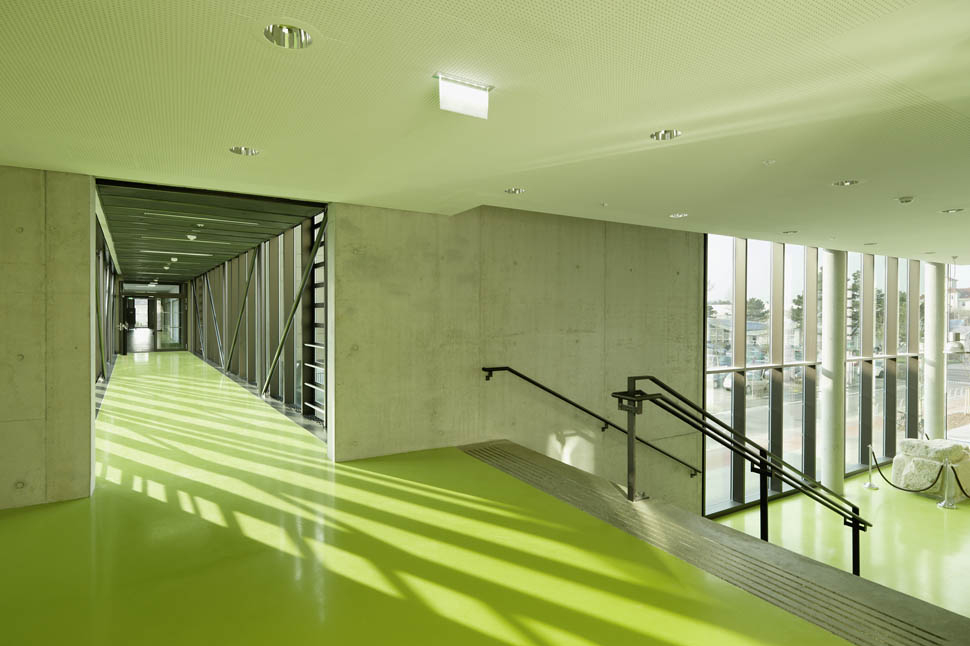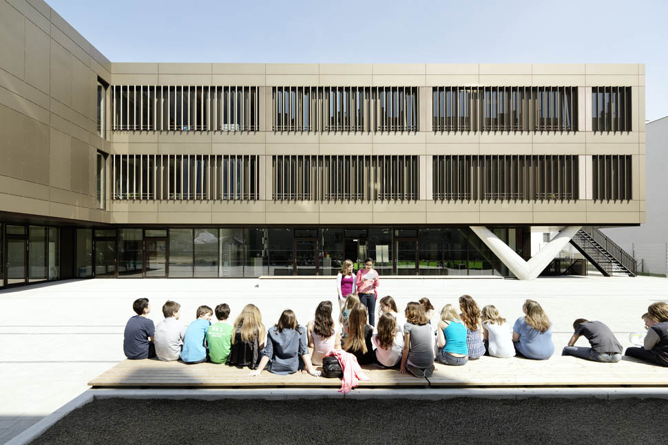 Eloxierte Streckmetall-Lamellen leisten witterungsunabhängigen Sonnenschutz. Die Maschenweite des Streckmetalls ist auf eine optimale Reduzierung der direkten Sonneneinstrahlung abgestimmt und soll dabei weitgehend ungehinderte Sicht nach außen bieten. Durch effektiven Sonnenschutz werden die Wärmelasten im Gebäude reduziert. Die dahinter liegende Stahlbetonkonstruktion als zweigeschossiges Vierendeeltragwerk ermöglicht das Überspannen der Turnhallen im UG.