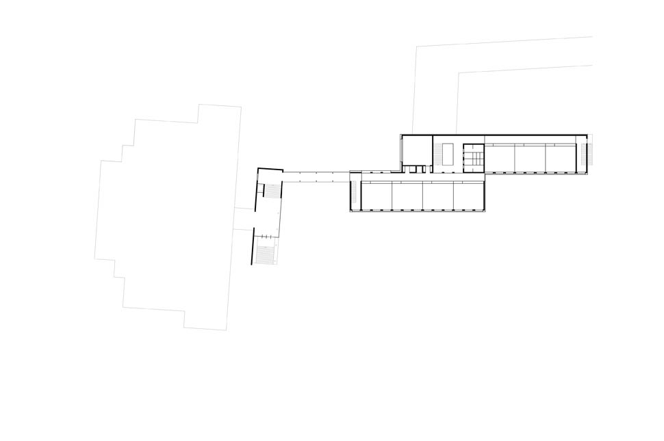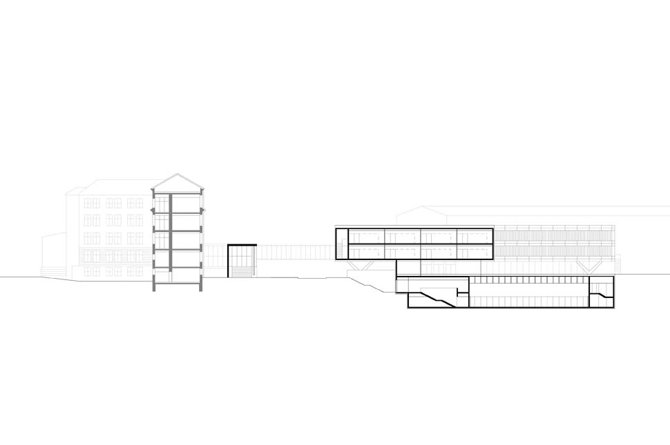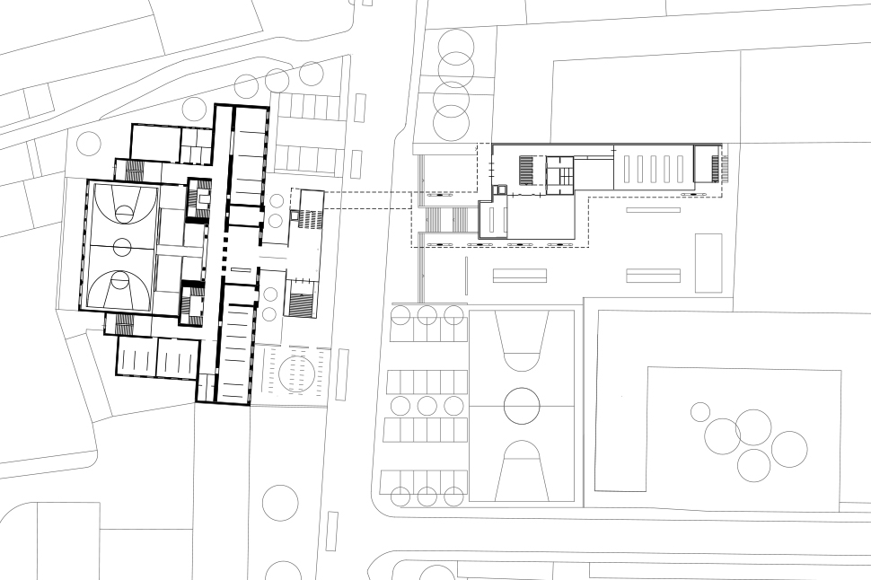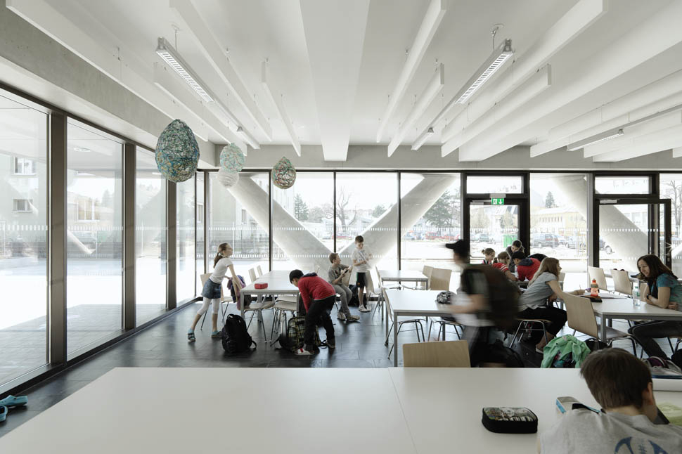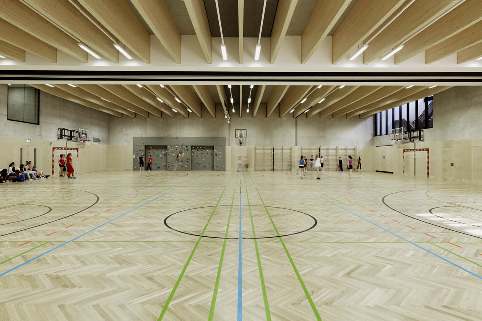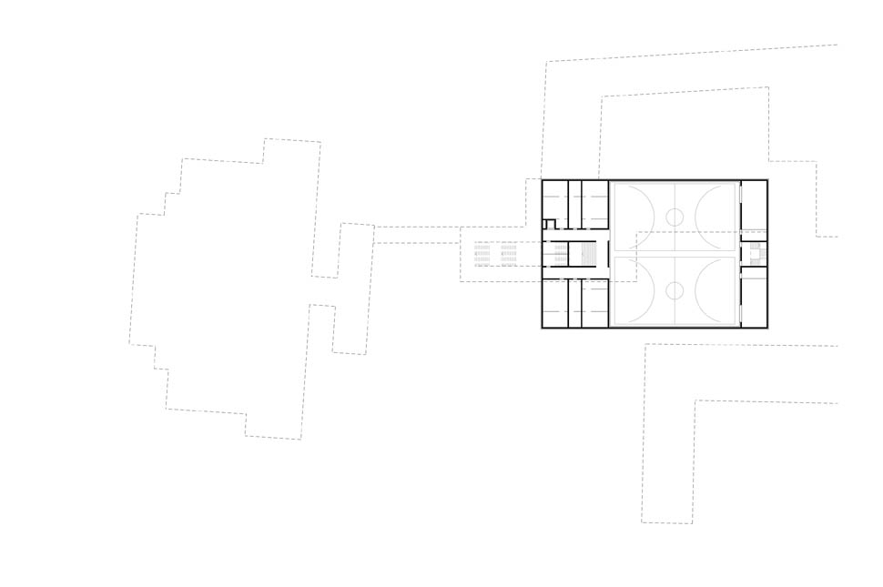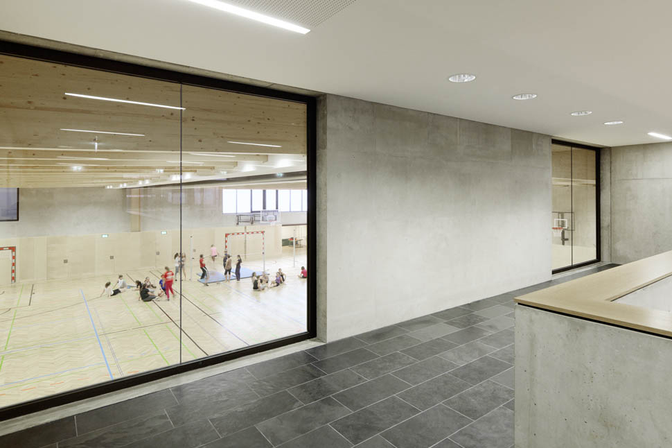 Durch die geänderte Zugangssituation wird das Erdgeschoss als Entrée aufgewertet und durch die Anordnung der Schulwartloge sinnvoll ergänzt. Der zentrale Luftraum zwischen 1.OG und Dach bleibt erhalten und wird durch ein neues Lichtdach aufgewertet. Durch die Addition der Galerie der Sporthalle zur zentralen Pausenfläche im 1.OG wird diese Zone für einen reibungsloseren Buffetablauf vergrößert. Mittels einer großzügigen Verglasung zur Sporthalle wird dieser innenliegende Bereich heller und attraktiver. Durch Umwidmungen werden bestandsschonend sinnvolle Funktionsbereiche gebildet, so dass im Erweiterungsbau lediglich allgemeine Unterrichtsbereiche, die Bibliothek und der Speisesaal für das Tages-schulheim, sowie die Sporthalle zu organisieren sind. Sinnfällig wird der allgemeine Unterrichtsbereich mit weitgehend nach Südwest orientierten Klassenräumen im 1. und 2. OG angeordnet, die Bibliothek und der Speisesaal im Erdgeschoss mit attraktiven Freiraumbezügen für die Pausennutzungen.
