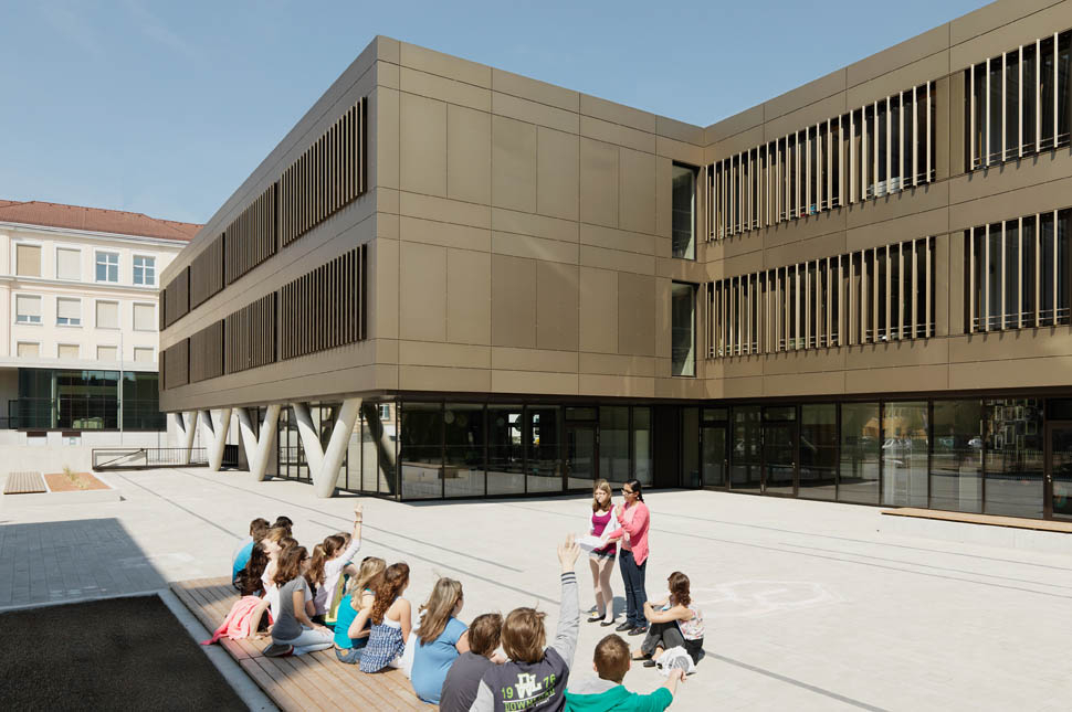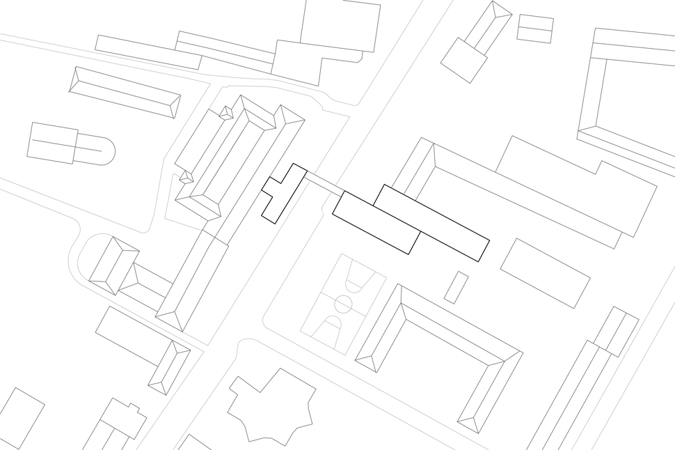 Durch die beengte Grundstückssituation wird die Sporthalle unter Terrain angeordnet und der Erweiterungsbau an die nordöstliche Grundstücksgrenze platziert. Das Gebäudekonzept des Neubaus auf zwei versetzten „Schienen“ reagiert zum einen auf die nachbarschaftlichen Belange und definiert zum anderen Eingangsplatz, Freiflächen für Speisesaal und Bibliothek sowie Sportfreiflächen. Darüber hinaus entwickelt sich aus der Gebäudestruktur der Brückenschlag über die Ehrenbrunngasse zum neu gestalteten Eingangsbauwerk, welches durch eine verglaste Fuge vom Bestand abgelöst ist und diesen so in seiner ursprünglichen Struktur belässt.