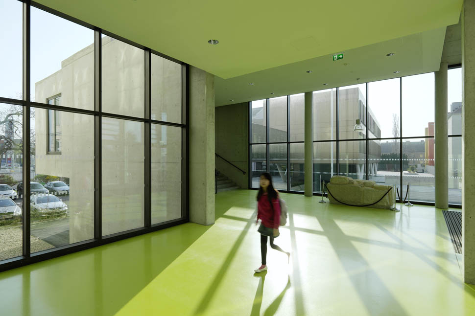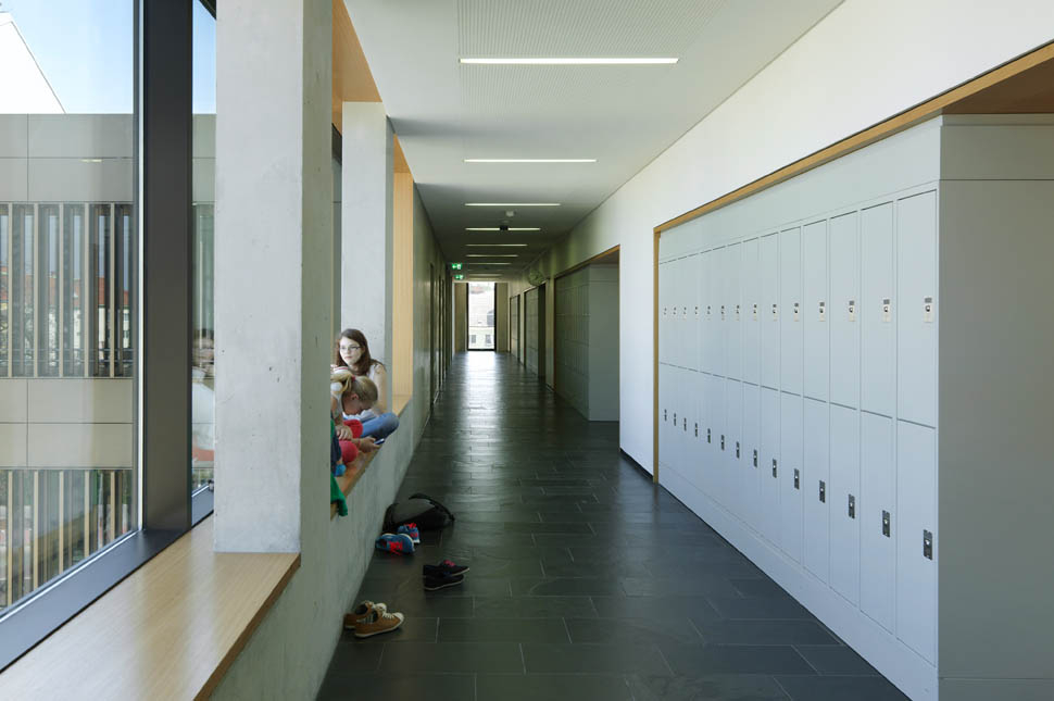 Die Klassenräume werden natürlich belüftet. Das Fußbodenheizsystems wird im Sommer zur Teilabkühlung genutzt. Baffeln sorgen für eine gute Akustik.