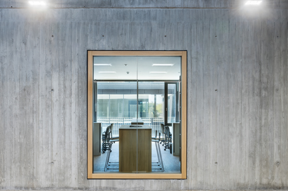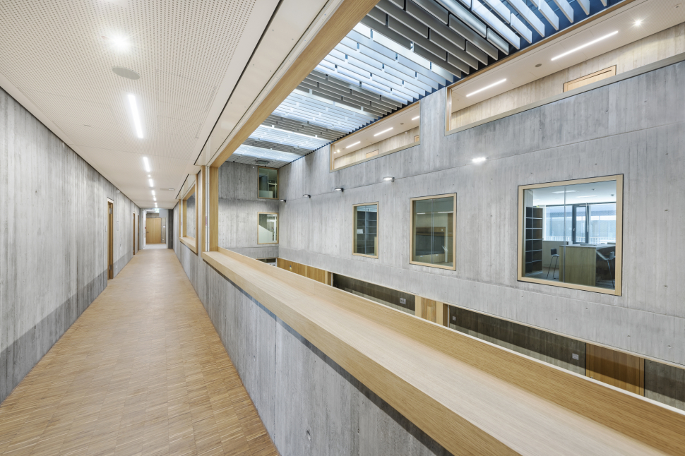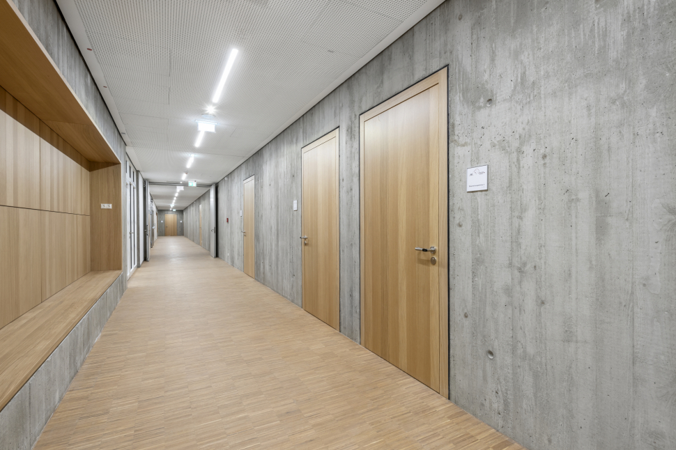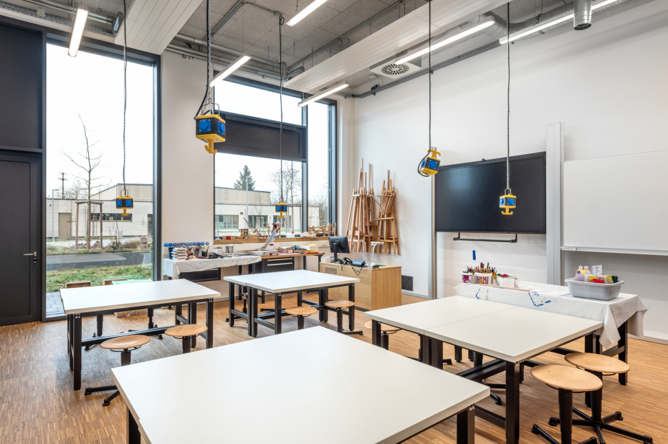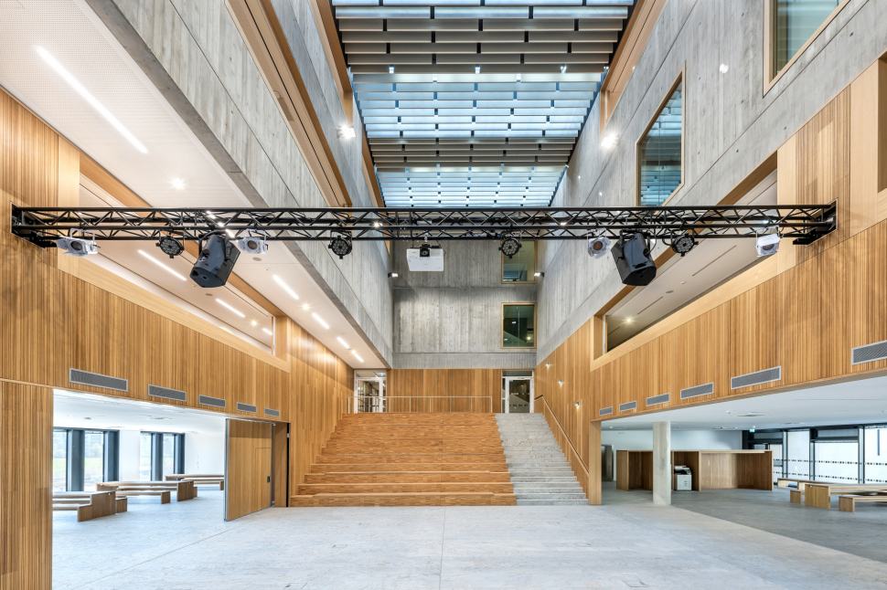Mit einer Durchlässigkeit im Erdgeschoss nach Westen werden Verknüpfungen zur Sporthalle hergestellt. Mittelpunkt des Baukörpers ist die Aula mit Mensa und Mehrzwecksaal. Die Theorie und Praxisräume werden kompakt in den drei Obergeschosse ringförmig um ein mit viergeschossiges Atrium und einen großzügigen Innenhof gestapelt.
