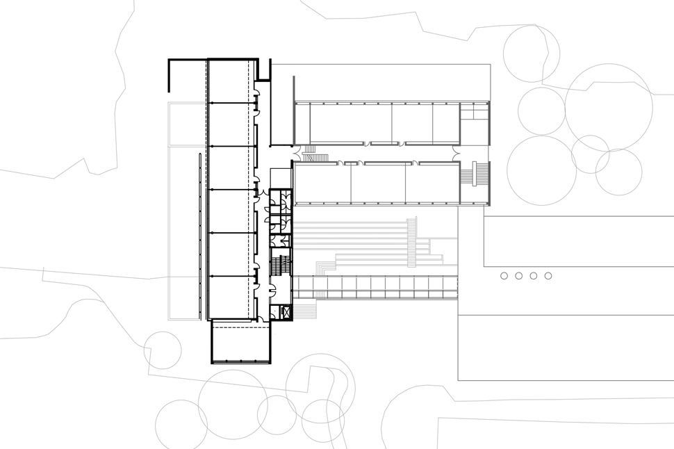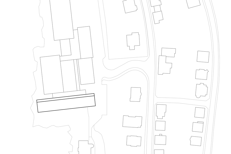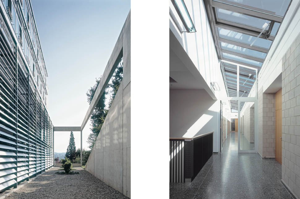 Darüber legt sich ein dreigeschossiger nach Süden orientierter Klassentrakt, der nach Osten auskragt. Verbunden werden die beiden Baukörper durch das fünfgeschossige nördliche Erschließungsbauteil, das gleichzeitig als Bindeglied zum Bestand genutzt wird. Dieser Bauteilausbildung entsprechend kommen zwei architektonische Prinzipien zur Anwendung. Zum einen die Verzahnung von Sockel und Patio mit dem Naturraum und zum anderen das „Loslösen“ des Klassentraktes von der Natur, um diese zu inszenieren. In den beiden Sockelgeschoßen ist eine behindertengerechte Verknüpfung mit dem zentralen Foyer gegeben, die sich im 1.Obergeschoss mit den Verkehrsflächen des Bestandsbauteil B zu einer Runderschließung ergänzt. Durch die Übernahme der Gebäude- und Geschoßhöhe von Bauteil B können mit dem Aufzug alle Ebenen, sowie das Vorplatzniveau behindertengerecht erreicht werden. Durch das Querstellen des Erweiterungsbaus zum Hang entstehen zwei neue Außenräume mit unterschiedlichen Qualitäten. Zum einen entsteht im Norden ein Hof zwischen dem Erweiterungsbau und dem Bestand, der als Pausenfläche genutzt wird und durch Sitzstufen sowie einer Baumbepflanzung aufgewertet wird. Zum anderen entsteht im Süden ein Patio mit kontemplativer Atmosphäre, der den Ausblick in den Wald wie auch auf die Villa Klingspor inszeniert.