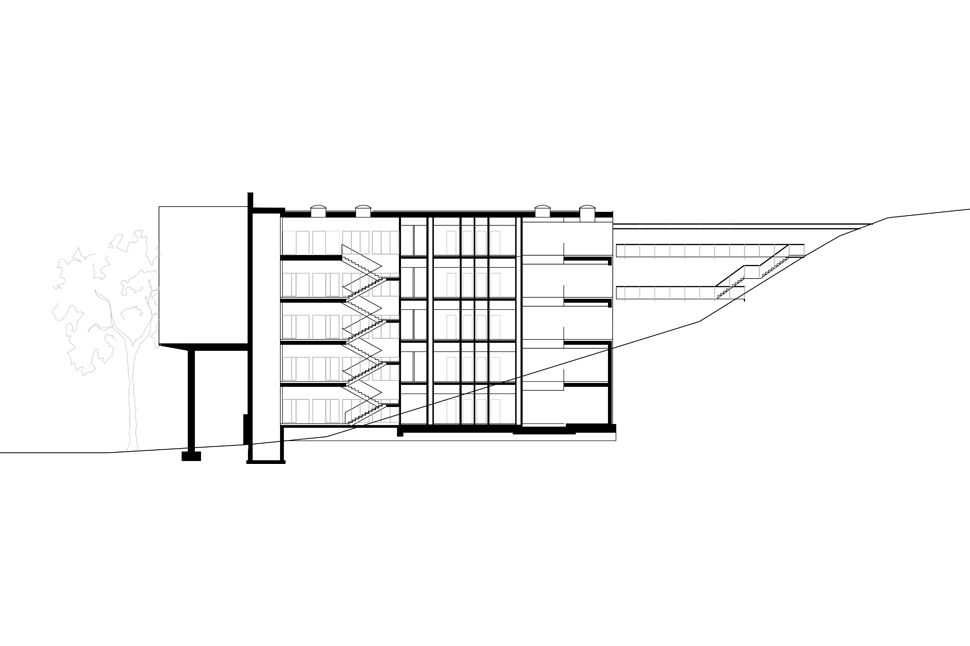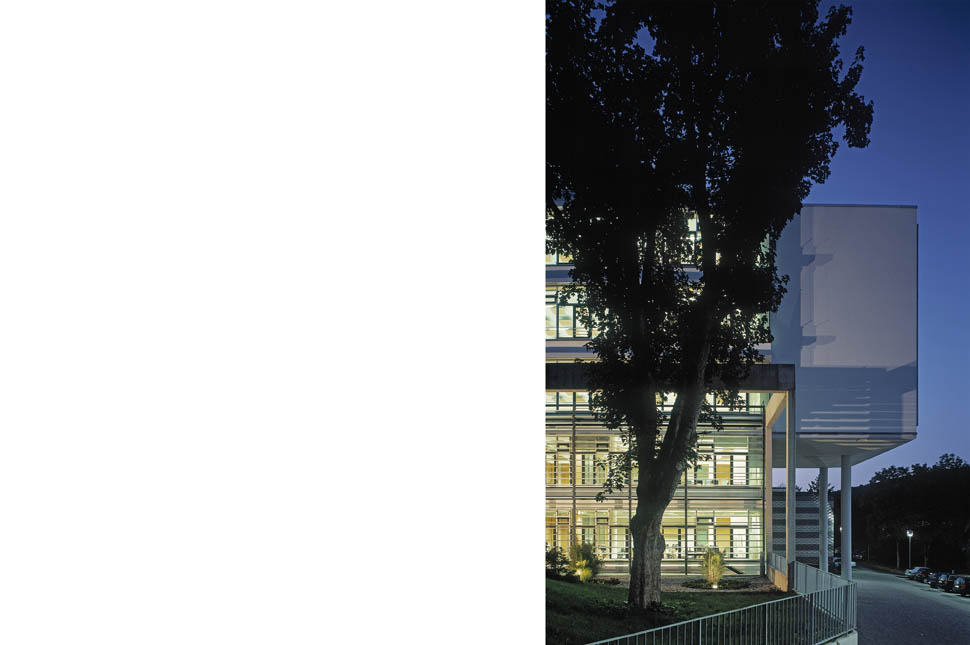 Das bestehende „Schulzentrum am Hang“ wird am südlichen Gebäudeende ergänzt durch den quer zum Hang ausgerichteten Erweiterungsbau unter Beibehaltung der bestehenden Gebäudehöhen. Die kompakte Lösung trägt den ökologischen und ökonomischen Gesichtspunkten Rechnung, wobei eine Differenzierung im Inneren und im Äußeren die Identifikation der Schüler fördern soll. Die Baukörper sind nutzungstechnisch eindeutig ablesbar.