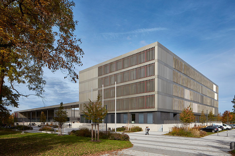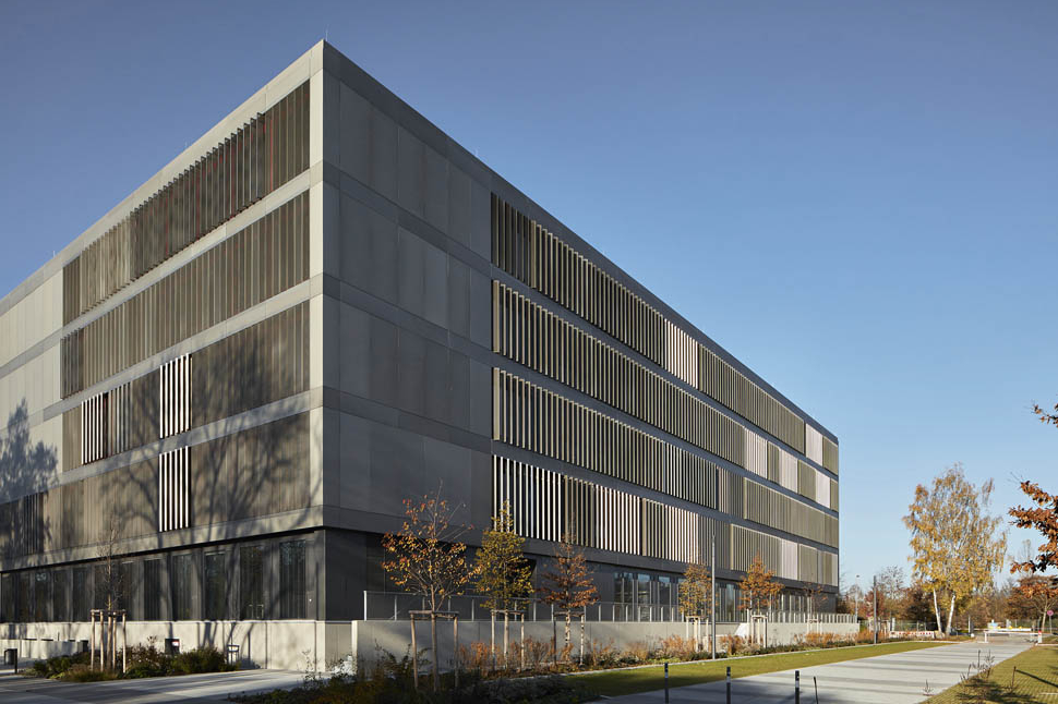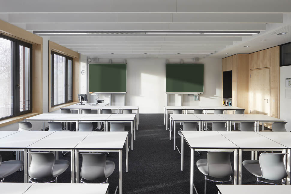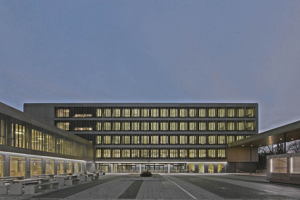 Drehbare Vertikallamellen mit den Abmessungen 45 x 330cm werden als Permanentverschattungsanlage eingesetzt, die den Wärmeeintrag für das Gebäude wirkungsvoll und witterungsunabhängig verhindern und gleichzeitig natürliches Licht in den Klassen optimieren und Ausblicke ermöglichen.