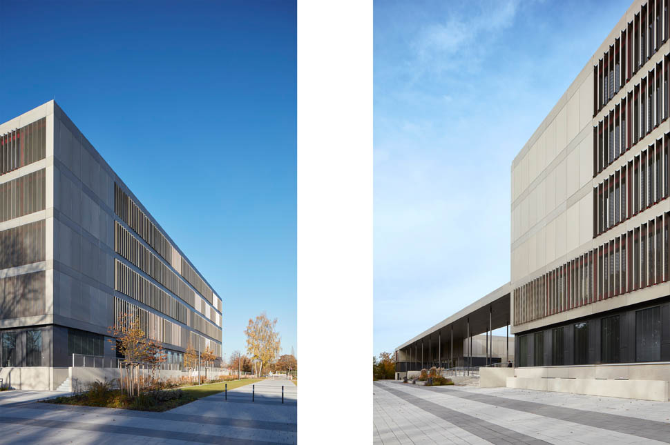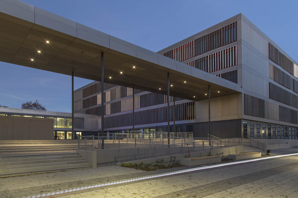 Durch das berufliche Schulzentrum sollen im heterogenen Umfeld stadträumliche Qualitäten geschaffen werden. Der Grünraum mit Baumkulisse wird dabei genutzt, um mit dem zweigeschossigen Sockel des Gebäudes einen boulevardartigen Erschließungs- und Freiraumbereich zu definieren, der die Besucher in die Mitte der Schule führt. Dieser zentrale Eingangsplatz für Schule und Sporthalle wird durch einen kolonnadenartigen Filter gefasst. Gleichzeitig findet sich hier die Mittagsbetreuung mit Außenraumbezug. Mit der südlichen Anordnung des hohen Schulgebäudes werden Bezüge zur künftig anschließenden Bebauung hergestellt. Der ruhende Verkehr wird weitgehend in dem natürlich belüfteten Sockel angeordnet.