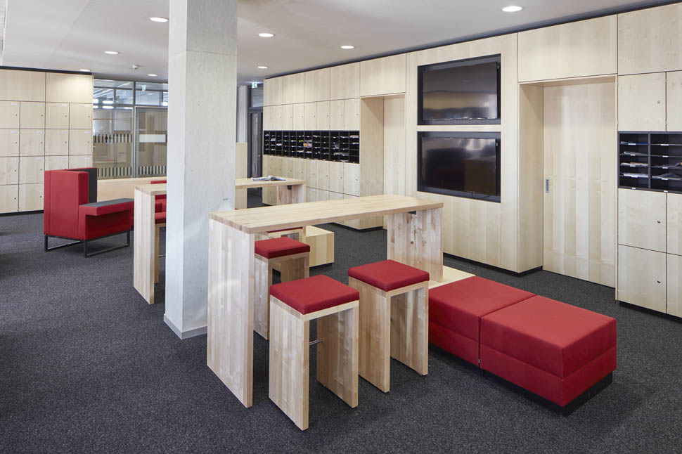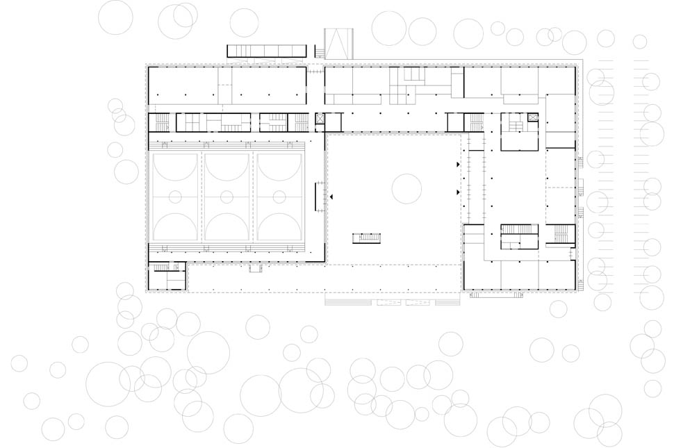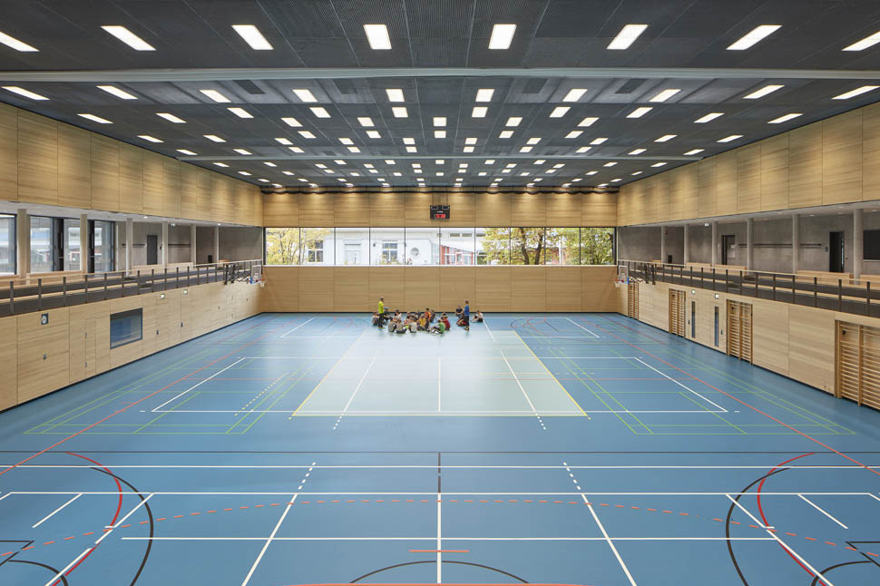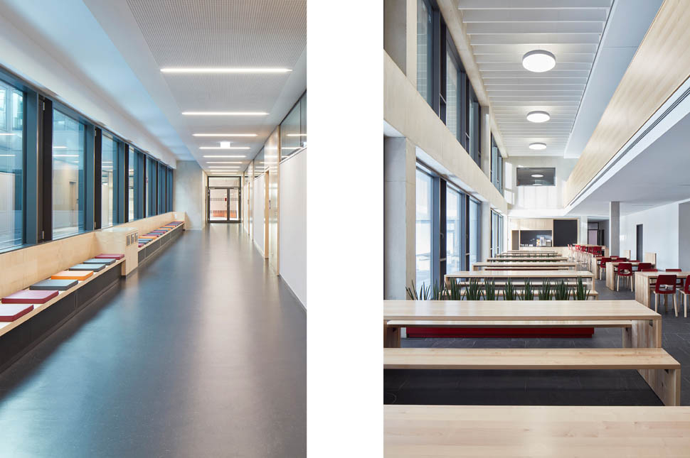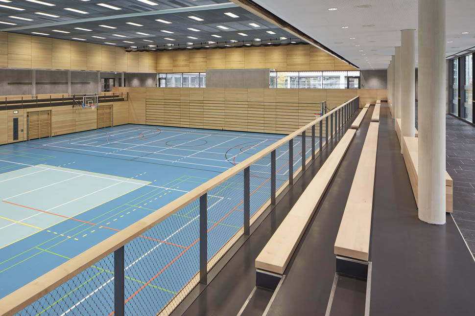 Das Schulzentrum besteht grundlegend aus zwei Elementen, dem zweigeschossigen Sockel mit Sporthalle, Werkstätten und Zentralbereich und aus dem dreigeschossigen Theorietrakt. Der Schulbaukörper ist ringartig um ein Atrium organisiert, welches im 1.OG als Luftraum für die zentrale Aula dient. In den Geschossen 2 bis 4 wird das Atrium zum Außenraum (Innenhof). Dies erleichtert die Orientierung im Gebäude und schafft eine kommunikative Atmosphäre sowie Blickbeziehungen. In den Obergeschossen werden jeweils zwei Fachcluster mit attraktiven mehrfach nutzbaren Aufenthaltszonen kombiniert. Diese Zonen bieten Ausblicke bei Aufenthaltszonen und Einblicke in den Innenhof. Auch die Arbeitsinseln werden dem Innenhof zugeordnet und somit natürlich belichtet. Im Sockelgeschoss sind Verwaltung, Lehrerbereich und zentrale Räume angeordnet. Der zweigeschossige Werkstattbereich wird linear organisiert. Durch das abgesenkte Spielfeld kann die Sporthalle in das zweigeschossige Konzept der Schulanlage integriert werden. Der Wettkampfnutzung entsprechend, können die Zuschauer so die Zuschauerränge an den beiden Längsseiten ebenerdig erreichen. In Kombination mit dem Foyer wird die Nutzung der Halle als Veranstaltungsraum der Schule unterstützt.