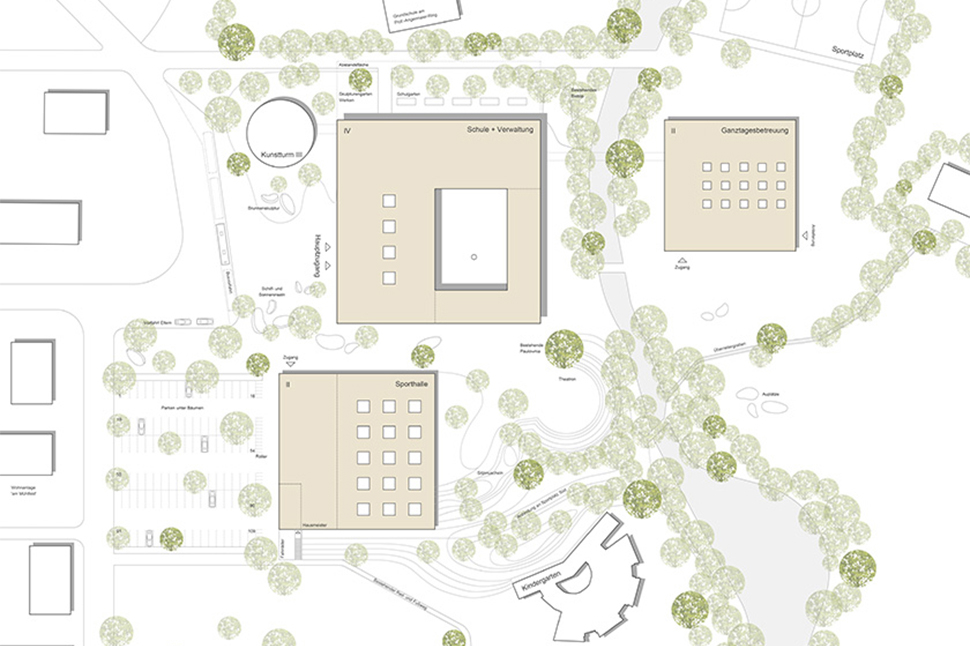 Neubau von Unterrichtsräumen, Fachklassen, Verwaltung und Dreifachsporthalle, Ganztagesbetreuung mit Aufenthaltsräumen, Mensa und Einfachsporthalle in Garching bei München